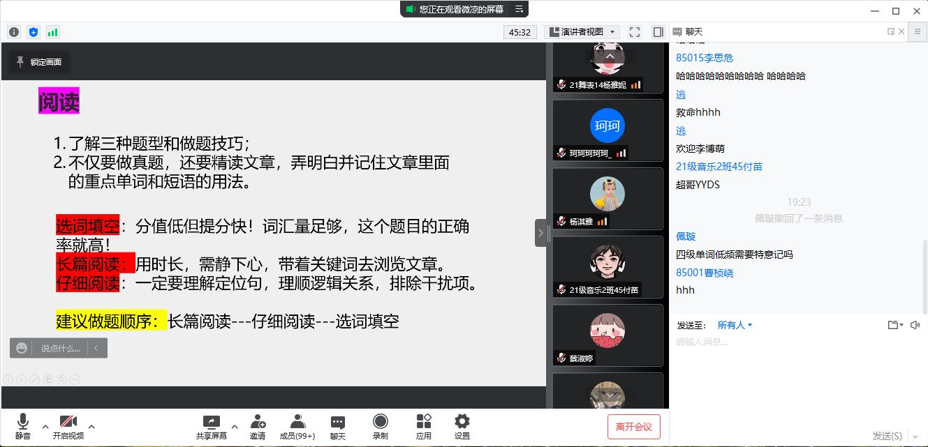 2022年3月31日晚19时,我院邀请外国语学院梁薇老师为学生举行了“CET-4迎考复习”线上指导专题讲座。学院党委副书记谭小红、院团委书记杨淇雅与全院学生一起聆听了讲座。