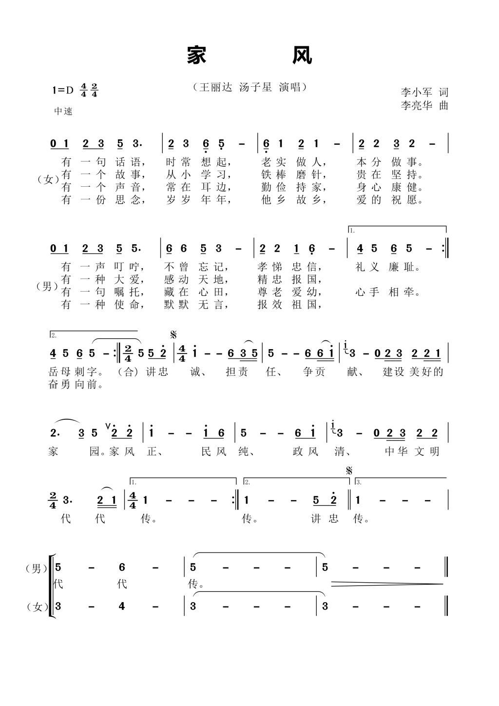 作曲作品:《家风》李亮华曲、李小军词、王丽达汤子星唱