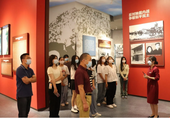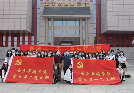 2022年9月30日上午,音乐舞蹈学院学生党支部组织50名学生党员和优秀积极分子,前往湖南党史陈列馆,开展“喜迎二十大,奋进新征程”主题教育活动。学院党委副书记谭小红、学生第一党支部书记邓志刚带队参加学习。
