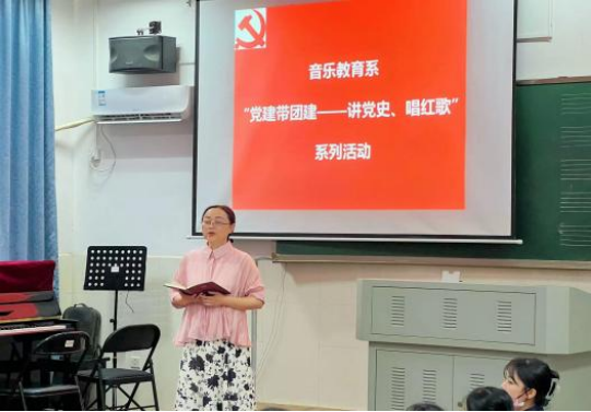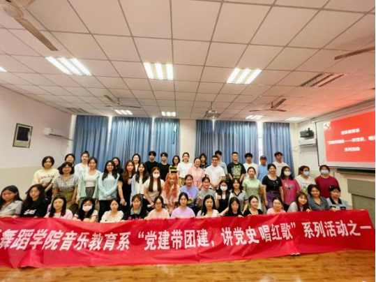 为了充分发挥学生党员的先锋模范作用,不断提高学生团员的宗旨意识和责任意识。6月1日中午,教育系党支部组织22级音本3班、21级884全体同学,在鹤鸣楼北202教室开展了“党建带团建——讲党史、唱红歌”活动。音教系党支部书记王海霞、副系主任李小雷,教师党员朱勇、潘江、刘珊参加本次活动。