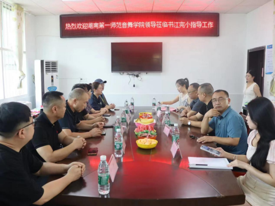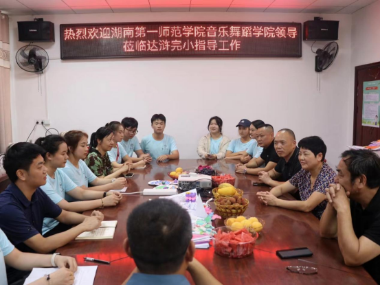 在两所学校,院领导走进课堂,视察了团队成员开展实践活动的具体情况。在两所学校的会议室隆重召开了座谈会。在座谈会上,两支队伍的队长向与会领导老师汇报了“三下乡”工作开展情况,达浒完小校长卢林与书江完小校长吕小姣细致地向院领导介绍学校的的基本情况,表达了对一师学子的高度肯定与赞扬。张应华院长勉励同学们牢记总书记殷殷嘱托,学会运用大数据,挖掘浏阳当地丰富的红色资源文化,结合音乐舞蹈专业特点,贯彻落实音乐舞蹈学院“站好讲台,站稳舞台”的培养目标,打造乡村红色美育教育,助力新时代红色教育和乡村振兴伟大事业,在实践中不断取得社会效益和教学培养效果双协调。邹华秀书记肯定了同学们的工作,并鼓励同学们积极工作、保持认真的态度对待此次“三下乡”实践活动,在保障安全的同时,坚持问题导向和系统观念,加深对红色美育的调查和研究,充分展现一师学子的青春风采。参加座谈的同学们积极表达了自己在此次“三下乡”实践活动的感悟与收获,并一致表示,一定会以积极奋进的态度、昂扬向上的风貌,以实际行动诠释新时代青年的责任与担当,让青春的光芒在乡村振兴的伟大事业中熠熠生辉。