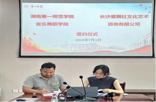 2024年7月1日上午,我院与长沙爱舞社文化艺术咨询有限公司合作的“演教研”项目签约仪式在学院504会议室举行。长沙爱舞社文化艺术咨询有限公司负责人王勇、李文皓,音乐舞蹈学院副院长刘炜、舞蹈学系主任刘琴出席会议。