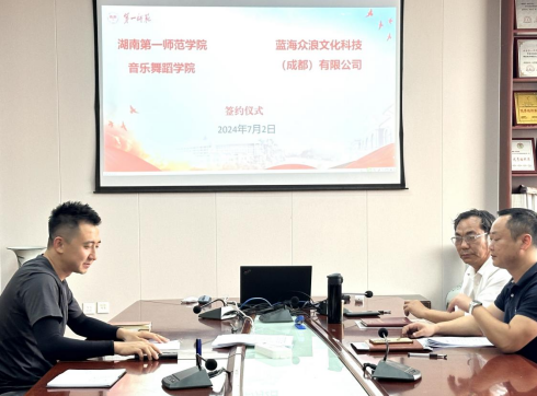 2024年7月3日下午,湖南第一师范音乐舞蹈学院与蓝海众浪文化科技(成都)有限公司在学院504会议室签署了“课程研发”校企合作合同。蓝海众浪文化科技(成都)有限公司负责人刘坚,音乐舞蹈学院院长张应华、副院长刘炜、舞蹈表演系教师周妙出席会议。双方携手开启新的合作篇章,旨在共同推动音乐舞蹈教育的发展,着力造就“站好讲台、站稳舞台、立身文创”的复合型音乐舞蹈艺术人才。