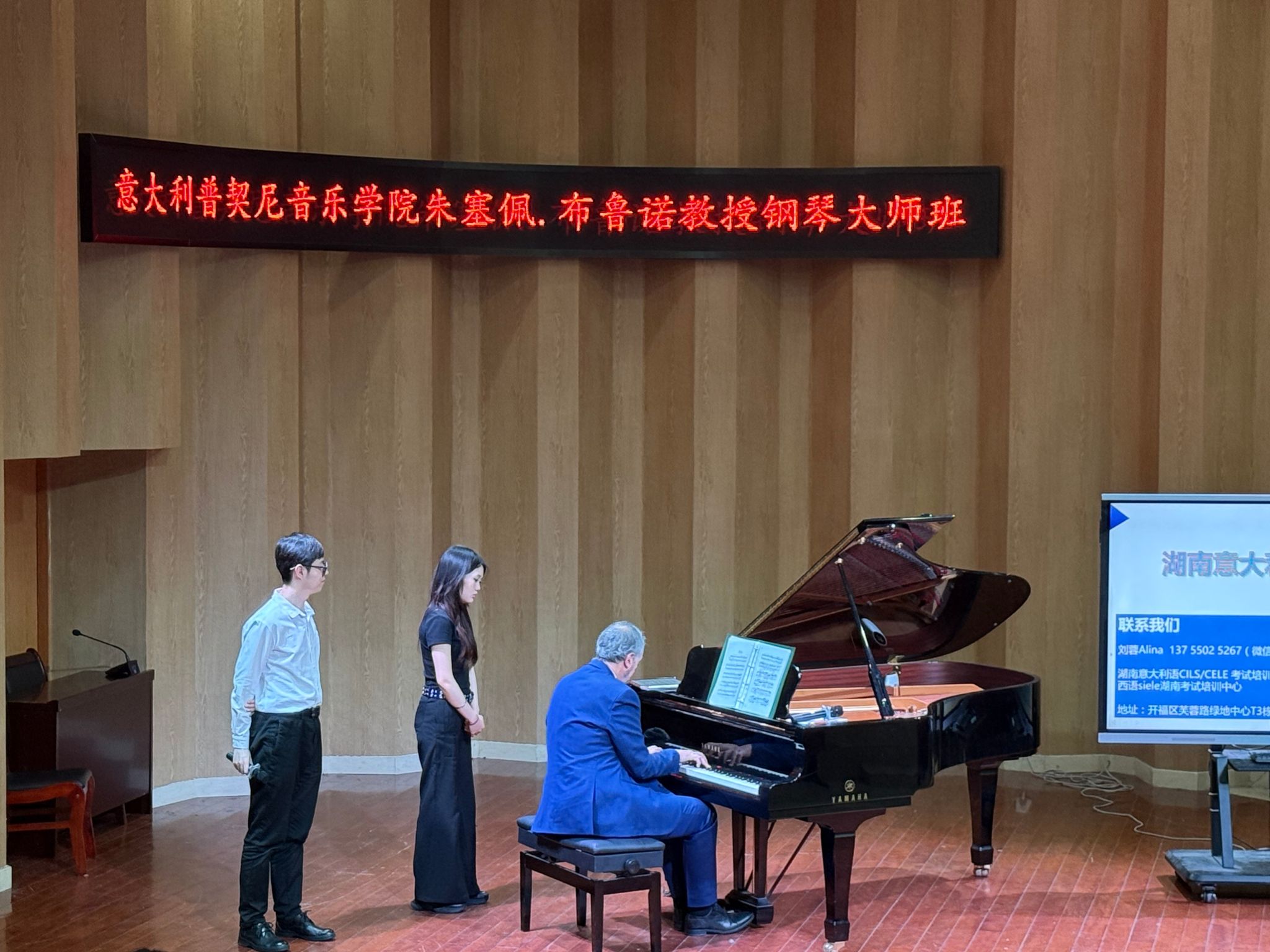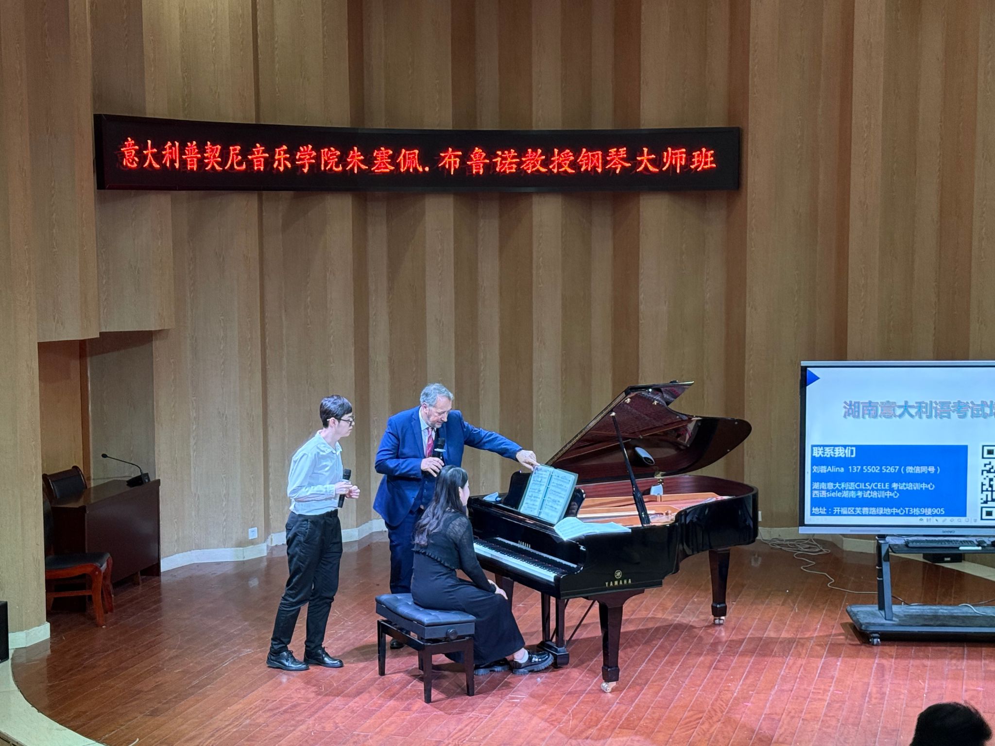 朱塞佩・布鲁诺教授开场即为学院师生带来了3首各具特色的独奏作品,展现了其作为钢琴演奏家的深厚功底和舞台风采。在钢琴大师班中,5位学生分别演奏了贝多芬、肖邦、拉赫马尼诺夫、普罗科菲耶夫的经典作品。布鲁诺教授肯定了同学们的技术功底,同时,从音色控制、情感表达、技术处理等方面进行了精准指导,强调钢琴演奏不仅是技巧的展示,更是对作曲家灵魂、对时代文化特性的诠释。他建议同学们在音乐诠释中融入更多文化批判性思考,同时希望通过此次活动共同推动“音乐文化外交”走深走实。